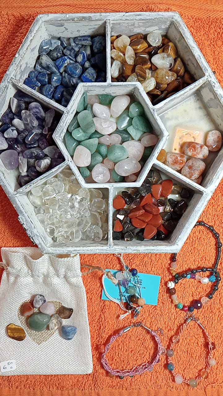 Pulseras 7 chacras, montadas en hilo elástico y con hematite , así como en diferentes modelos en macrame. También en colgantes , así como el bolsitas para el bolso, viaje, etc. Precios desde 5€ dependiendo del modelo o bolsita.