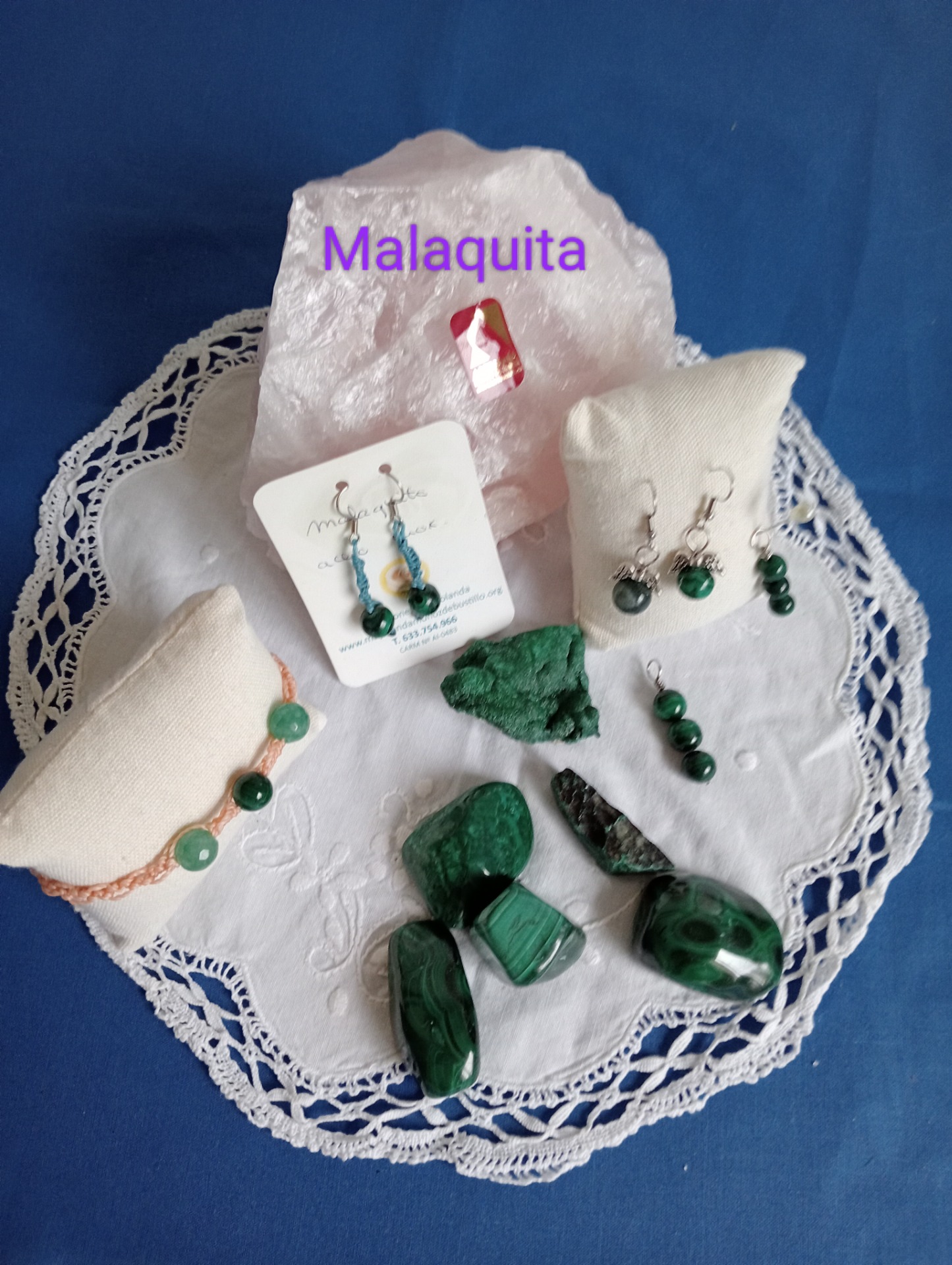Malaquita, cristal natural en piezas naturales, pulidas montadas con pendientes, pulseras. Dolores menstruales, piel, perdidas dolorosas, emocionales y personales.